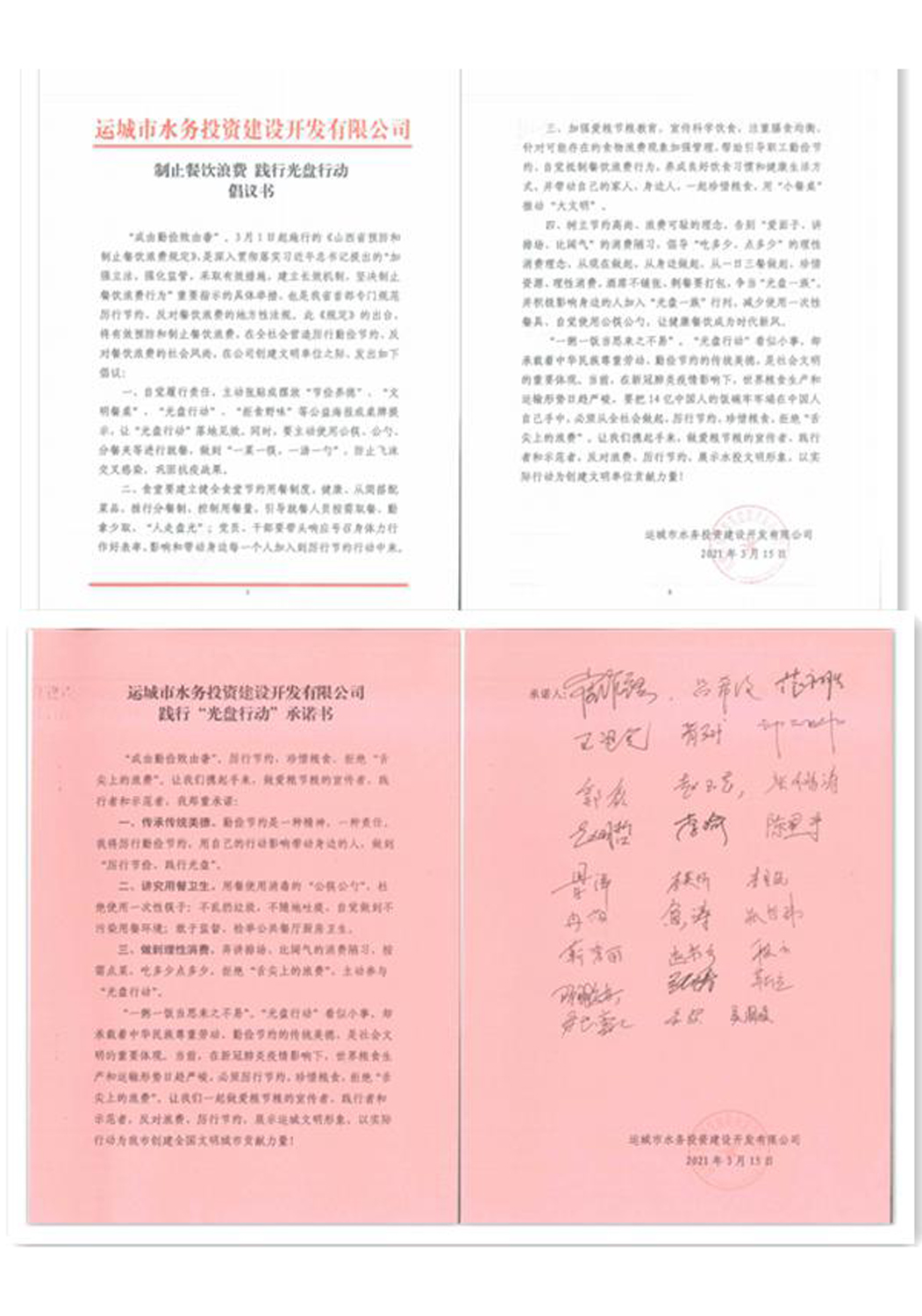 為響應(yīng)中央、省、市堅(jiān)決制止餐飲浪費(fèi)行為的號(hào)召,水投公司積極按文件要求,采取多種形式進(jìn)行宣傳落實(shí)。3月16日,公司以“制止餐飲浪費(fèi)、踐行光盤(pán)行動(dòng)”為主題,組織開(kāi)展了系列活動(dòng),在公司及項(xiàng)目公司餐廳張貼公益海報(bào),在公司大廳一樓大屏幕播放宣傳語(yǔ)。同時(shí),在公司微信群發(fā)送了制止餐飲浪費(fèi)、踐行光盤(pán)行動(dòng)倡議書(shū)及承諾書(shū),全體干部職工紛紛響應(yīng),簽署了《制止餐飲浪費(fèi)、踐行光盤(pán)行動(dòng)承諾書(shū)》。