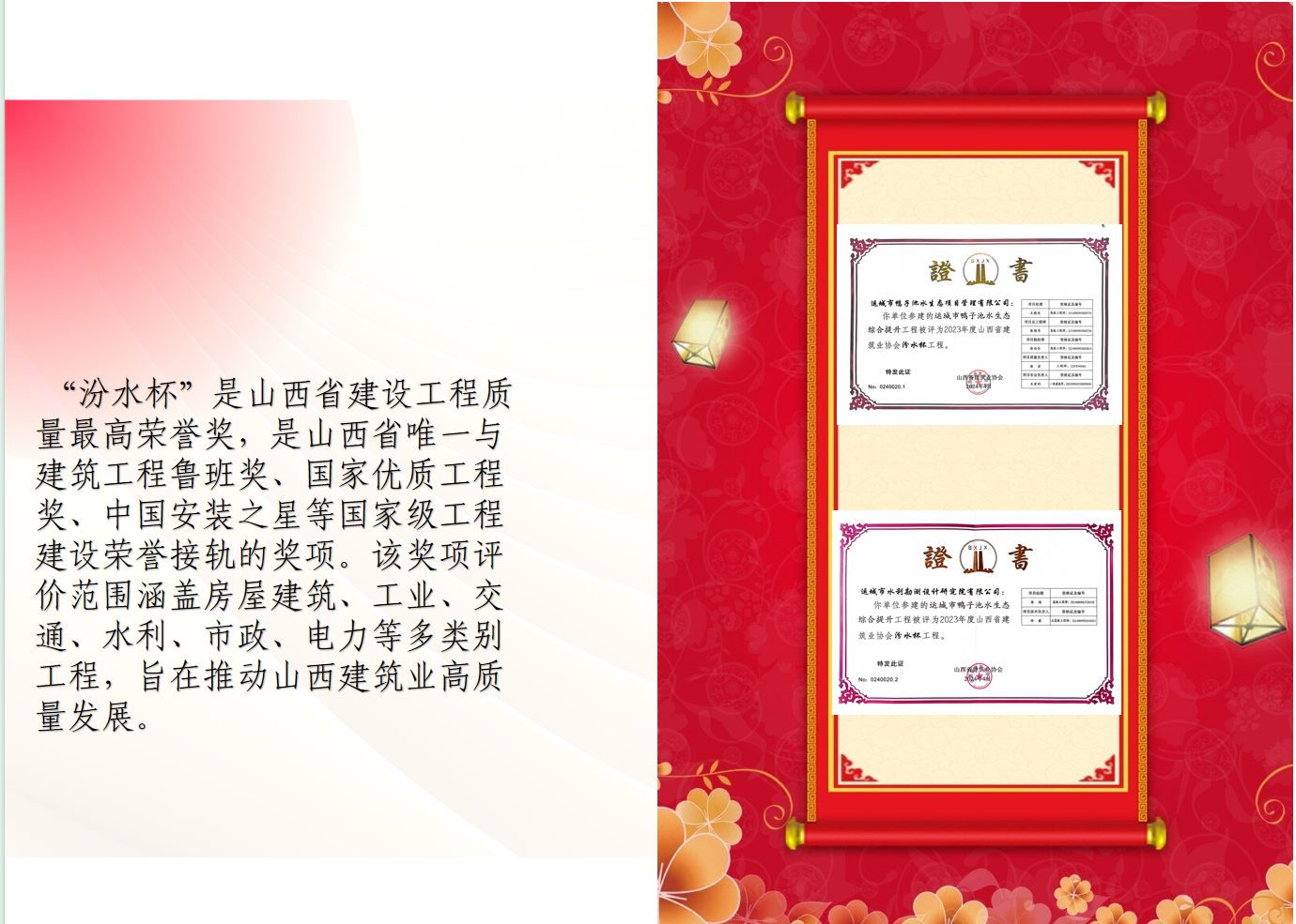 2024年以來,由運城市水利勘測設(shè)計研究院有限公司設(shè)計的《鴨子池水生態(tài)綜合提升工程》一舉斬獲“山西省勘察設(shè)計協(xié)會設(shè)計三等獎”、“山西省建筑業(yè)協(xié)會‘汾水杯’獎”、“中國市政工程協(xié)會最高水平評價工程獎”等三項行業(yè)殊榮。